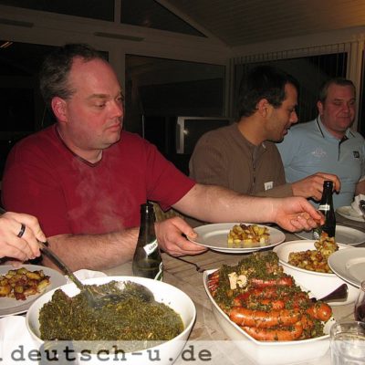 Ein Blick auf die Uhr sagte uns: Alarm! Zeit zum Essen! Alle waren noch naß! Keine trockenen Klamotten! Alles voller Flugsand! Mist! Was soll’s, zur Not zieht man die Jeans eben ohne Unterhose an, ein ganz neues Gefühl! Pünktlich um 18.00 Uhr c.t. saßen wir dann auch am Tisch.