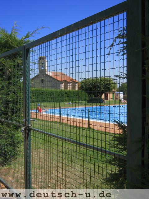 Der Pool ist am Ende der Plaza Mayor, besser bekannt unter dem Manen Pinien-Plaz. Unten am Eingang steht ein Schild: Poolbar — Eintritt frei. Also nix wie rein, denkt sich der naive Beobachter.