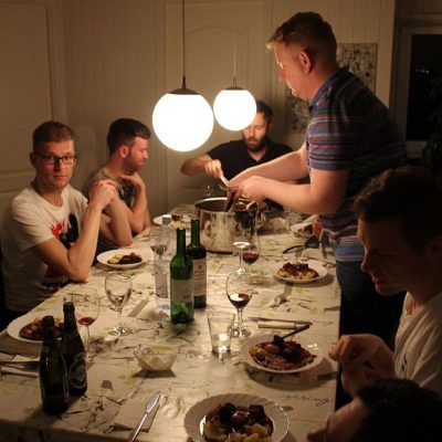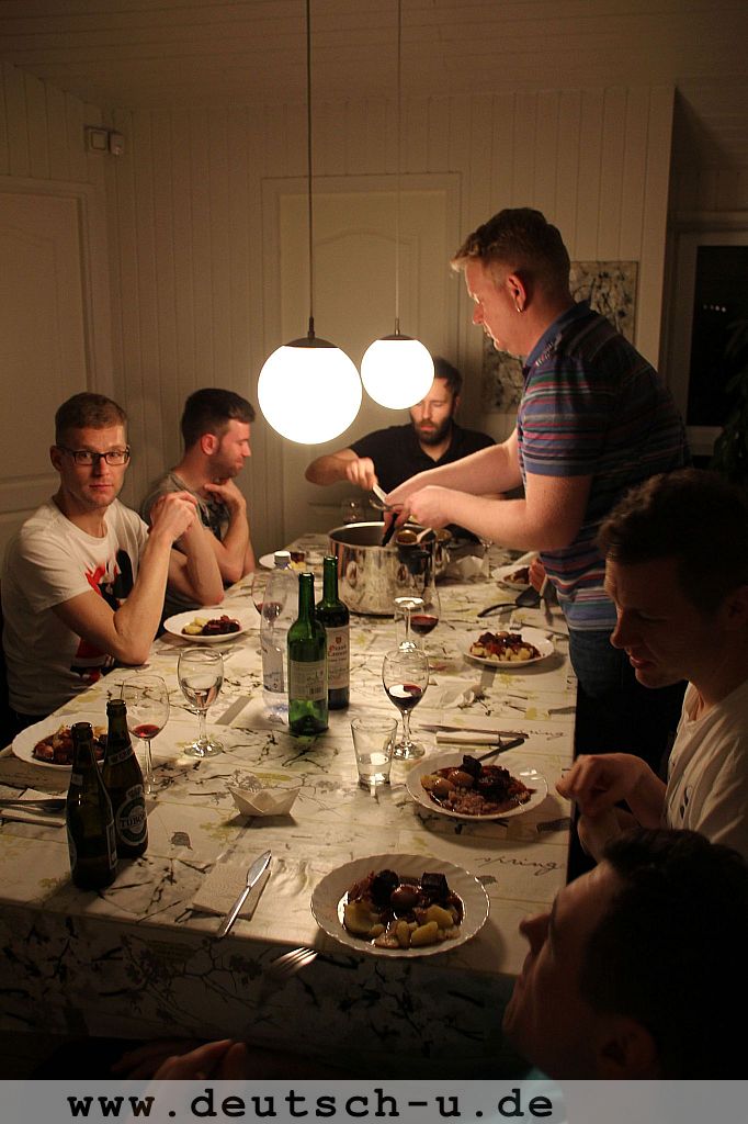 Der Chefkoch ist Leif. Das steht definitiv fest. Und er versteht es bestens, die Leute um ihn herum als Küchenhilfe für Schnippeleien einzuspannen. Nur bei Martin muss man dabei vorsichtig sein, denn er bringt es fertig, sich mit einer Kartoffelreibe selbst aufzureiben!